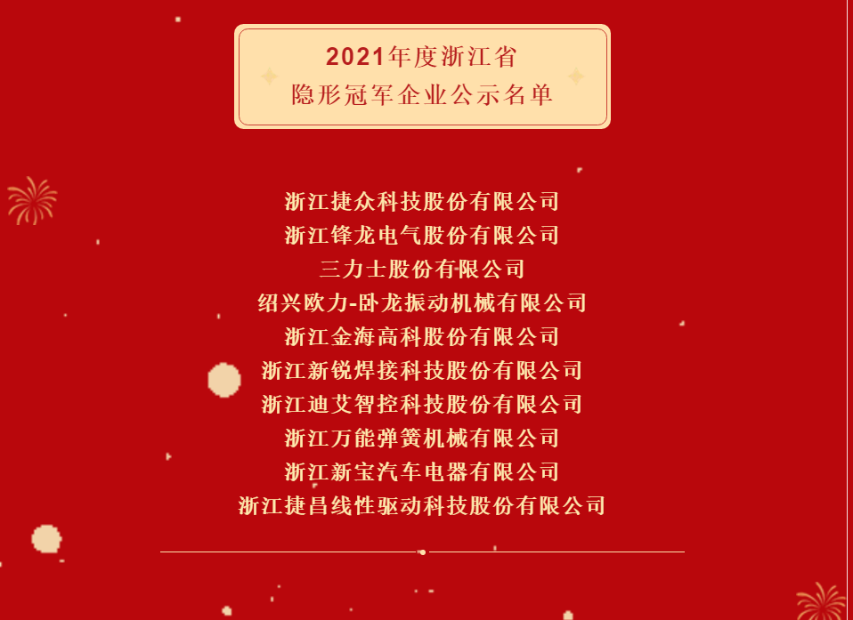 农历新年将至,四处洋溢着浓浓的年味儿,bf88必发高科作为环保、空滤行业的龙头企业,在这一年中最热闹喜庆的时候,凭借着突出的行业地位及丰硕的科研成果,当选由浙江省经济和信息化厅主导评选的2021年度浙江省隐形冠军企业,为即将到来的虎年春节增添了更多欢乐气氛。