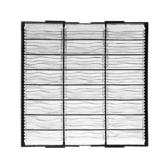 该过滤网板为折叠结构,通过注塑模具塑料成型,固定折间距和高度,有效增加空气过滤面积,同时可以根据空调设计风量选择不同密度、不同功能的过滤网。可完成折高从8mm~35mm折滤网生产,计重效率根据滤网不同,效率可以从选择40%~80%,并可复合抗菌防霉、阻燃、负离子、抗病毒等多种功能