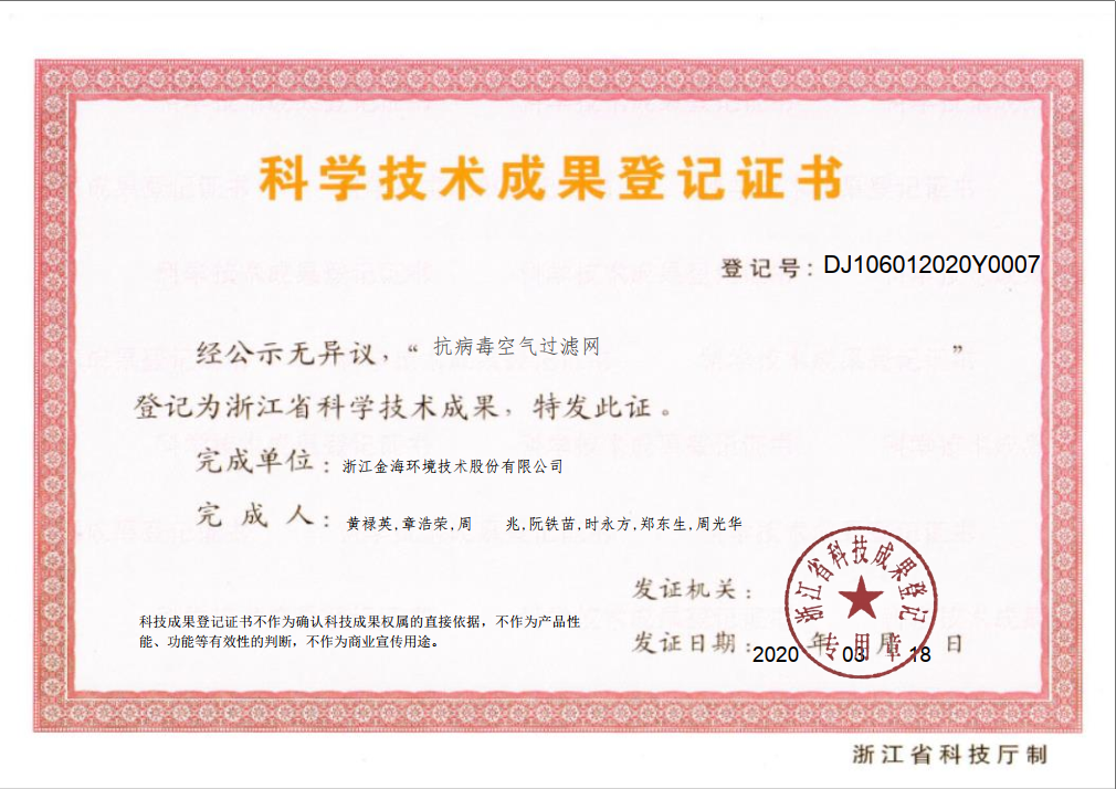 抗病毒空气过滤网科学技术成果登记证书