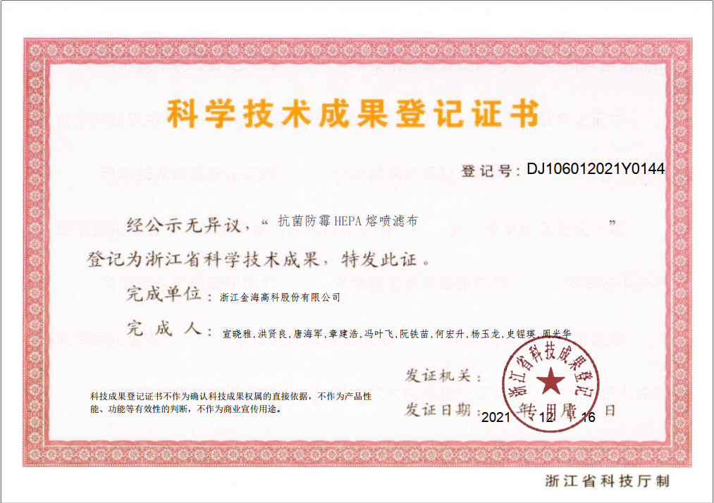 抗菌防霉HEPA熔喷滤布科学技术成果登记证书